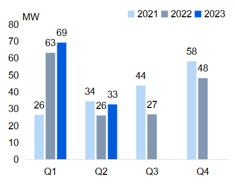 圖:2021-2023美國工商儲(chǔ)市場裝機(jī)(MW)