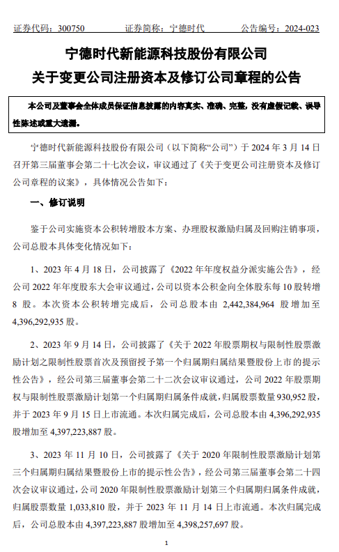 近日,寧德時代發(fā)布《關(guān)于變更公司注冊資本及修訂公司章程的公告》。
