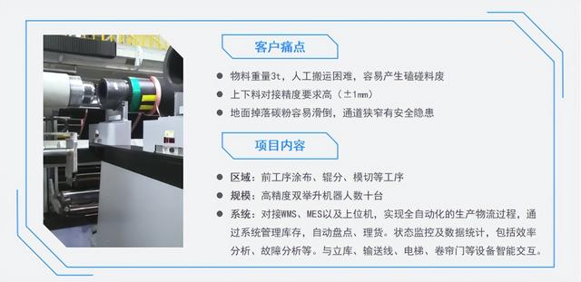 在某儲(chǔ)能頭部企業(yè)實(shí)現(xiàn)產(chǎn)線物流無人化的項(xiàng)目中,磅旗無人工場(chǎng)數(shù)字化方案籠罩前段與中段產(chǎn)線物流全過程,包含涂布上下料、極卷緩存搬運(yùn)、輥壓分切上料、輥壓分切下料、模切上下料、卷繞上料、隔閡運(yùn)輸、空卷筒回流運(yùn)輸?shù)裙に囘^程。實(shí)現(xiàn)全過程主動(dòng)化、無人化、物料多級(jí)智能拉動(dòng)、上下工序智能協(xié)同。