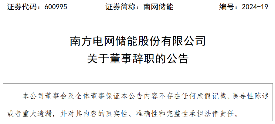 南網(wǎng)儲(chǔ)能于4月16日發(fā)布晚間公告稱(chēng),2024年4月16日,南方電網(wǎng)儲(chǔ)能股份有限公司(以下簡(jiǎn)稱(chēng)“公司”)董事會(huì)收到非獨(dú)立董事江裕熬先生遞交的書(shū)面辭職報(bào)告,江裕熬先生由于達(dá)到法定退休年齡,申請(qǐng)辭去公司董事及董事會(huì)科技創(chuàng)新委員會(huì)委員職務(wù)。