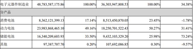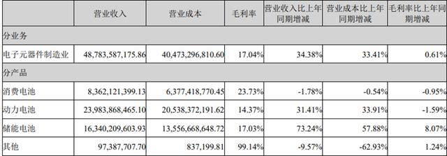 由于多數(shù)訂單為長期合同,儲能電池業(yè)務(wù)受價格戰(zhàn)影響較小,營業(yè)收入達(dá)到163.4億元,同比增長73.24%,占總營收的33.5%,毛利率也提升了8.07個百分點至17.03%。