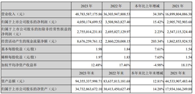 2023年,億緯鋰能實現(xiàn)營業(yè)收入487.8億元,同比增長32.38%;歸母凈利潤為40.5億元,同比增長15.42%,其中本部業(yè)務(wù)凈利潤為35.4億元,同比增長30.19%;扣非更是同比只增長2.23%;毛利率達(dá)到17.04%,同比增長0.61個百分點;凈利率達(dá)到9.27%,同比降低0.84個百分點。