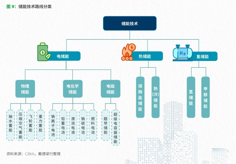 儲能,是指通過不同方式、利用特定的裝置或物理介質(zhì),將不同形式的能量儲存起來,以便在需要時利用的技術(shù)。根據(jù)技術(shù)路徑不同,儲能形式主要分為電儲能、熱儲能和氫儲能三大類,其中電化學與物理儲能為現(xiàn)階段主要技術(shù)路線。儲能系統(tǒng)是新型電力系統(tǒng)有效的調(diào)峰調(diào)頻、平滑波動手段及重要的備用資源,大力發(fā)展儲能對提高光伏、風電等可再生能源利用率,實現(xiàn)“雙碳”目標具有重要意義。