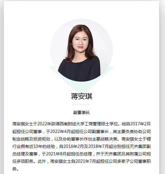 資料顯示,蔣安琪在鋰行業(yè)擁有近10年工作經(jīng)驗,自2016年2月、2018年7月起分別擔任天齊集團副總經(jīng)理、董事,并于2021年8月至2023年6月?lián)翁忑R集團總經(jīng)理,她同時在天齊集團及其附屬公司擔任多項職務。此外,蔣安琪自2021年7月起擔任天齊鋰業(yè)多家子公司董事職務。