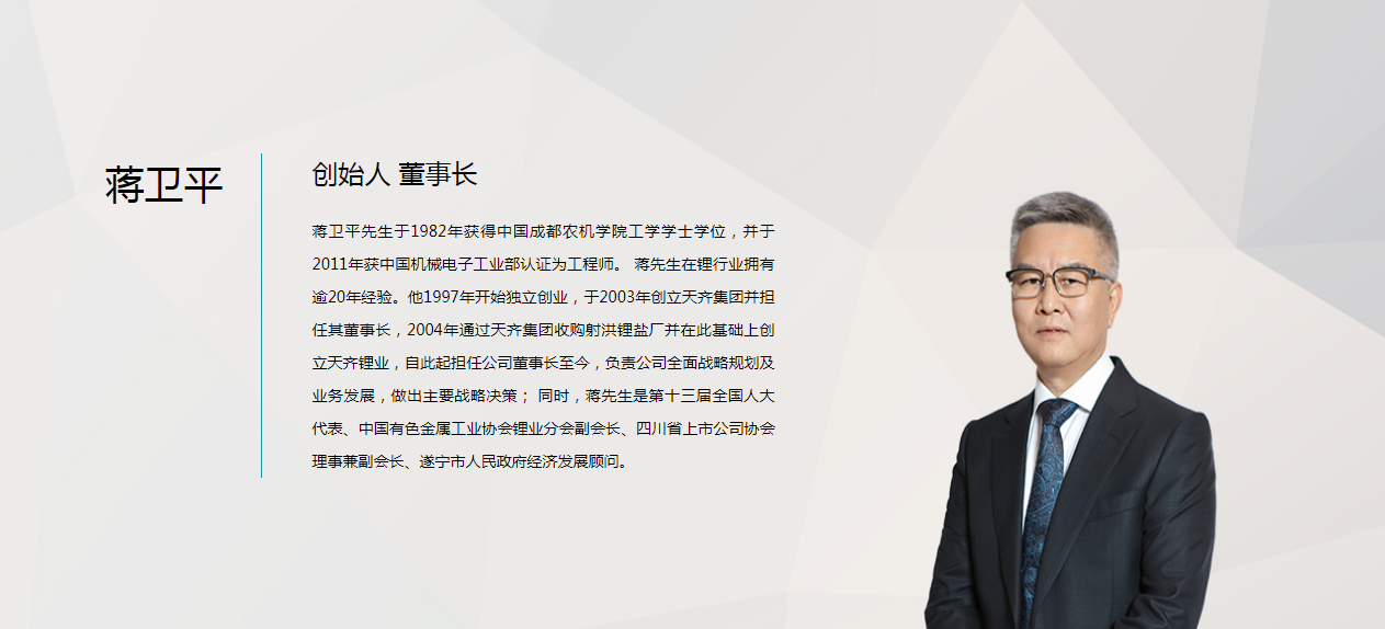 自擔任天齊鋰業(yè)副董事長以來,蔣安琪主要負責協(xié)助公司制定戰(zhàn)略及投資規(guī)劃以及協(xié)助董事長蔣衛(wèi)平作出主要戰(zhàn)略決策。