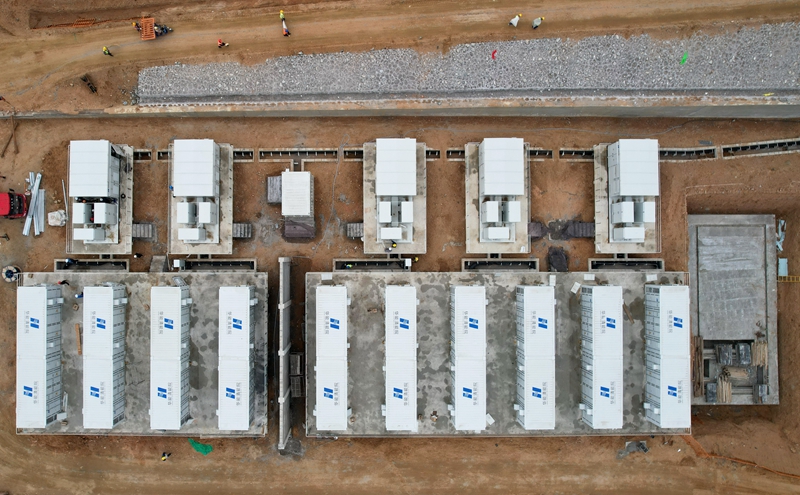 5月20日,工人在位于河北省平山縣的“平山西柏坡百兆瓦級(jí)新型電力系統(tǒng)示范工程”建設(shè)工地施工(無(wú)人機(jī)照片)。