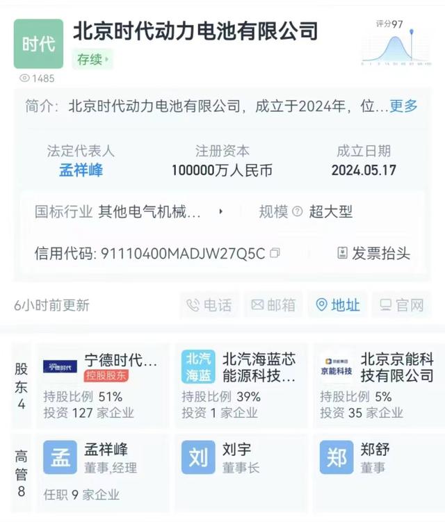 《中國經(jīng)營報(bào)》記者在天眼查上看到,5月17日,北京時(shí)代動力電池有限公司成立,法定代表人為孟祥峰,注冊資本10億元人民幣,是一家以從事電氣機(jī)械和器材制造業(yè)為主的企業(yè)。股東信息顯示,該公司由寧德時(shí)代、小米汽車科技有限公司、北汽海藍(lán)芯能源科技(北京)有限公司、北京京能科技有限公司共同持股。