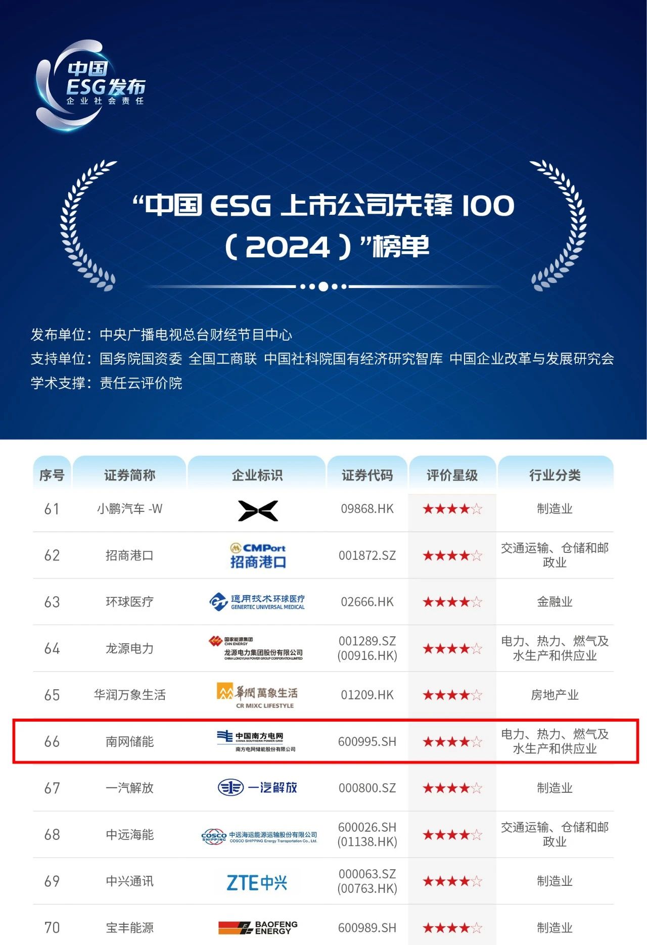 提升26位!南網(wǎng)儲(chǔ)能蟬聯(lián)“中國(guó)ESG上市公司先鋒100”榜單