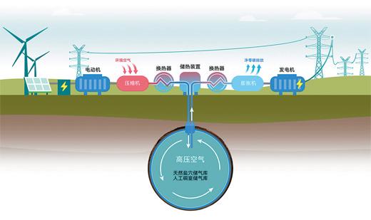 用電高峰時(shí),地下儲(chǔ)氣庫(kù)會(huì)釋放所儲(chǔ)存的高壓空氣、儲(chǔ)熱罐釋放所儲(chǔ)存的熱量。這時(shí),高壓空氣被加熱,使其具有極大的膨脹力來(lái)驅(qū)動(dòng)空氣透平發(fā)電機(jī)組,就像吹動(dòng)風(fēng)電機(jī)組的“大風(fēng)車(chē)”一樣,產(chǎn)生電能向電網(wǎng)供電。