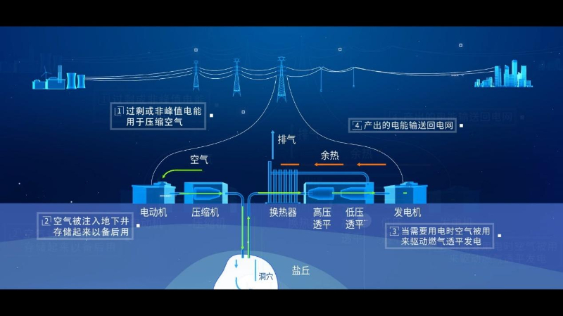 儲能時,利用過?;蚍欠逯惦娔茯寗与妱訖C旋轉,將電能轉化為機械能,電動機帶動壓縮機(一種將低壓氣體提升為高壓氣體的機械)將空氣從低壓狀態(tài)壓縮至高壓狀態(tài),并將高壓空氣儲存在儲氣裝置(鹽穴、人工硐室或儲氣罐)中,最終將電能轉換成空氣熱能和壓力能。