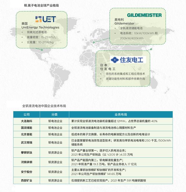2022 年全釩液流電池整個行業(yè)還處于商業(yè)化進(jìn)程緩慢階段,全球范圍內(nèi)只有日本住友電工、美國 UniEnergyTechnologies、奧地利 Gildemeister 和中國大連融科能提供成熟的商業(yè)化產(chǎn)品。2023年,隨著我國在長時儲能、價(jià)格補(bǔ)償、鼓勵釩資源開發(fā)等支持政策的落地生效以及資本市場的追捧,全釩液流電池賽道創(chuàng)新企業(yè)涌現(xiàn),推動我國全釩液流儲能技術(shù)和產(chǎn)業(yè)發(fā)展向世界領(lǐng)先水平邁進(jìn)。