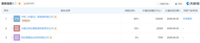 據(jù)信息顯示,內(nèi)蒙古華電阿拉善綠色能源有限公司的法定代表人是盧茂茂。該公司由華電(內(nèi)蒙古)新能源有限公司、內(nèi)蒙古阿拉善能源有限責(zé)任公司、以及阿拉善盟運(yùn)達(dá)風(fēng)電有限公司共同持有股份,其中中國華電旗下的華電(內(nèi)蒙古)新能源有限公司持有80%的股份。