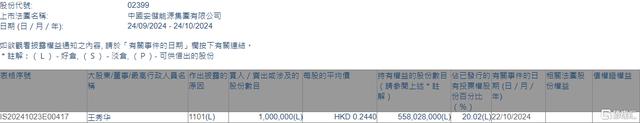 根據(jù)聯(lián)交所最新權(quán)益披露資料顯示,2024年10月22日,中國安儲能源(02399.HK)獲股東王秀華在場內(nèi)以每股均價0.244港元增持100萬股,涉資約24.4萬港元。
