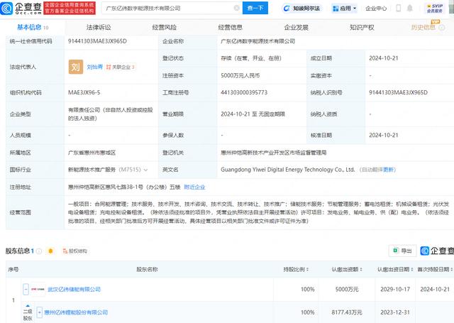 近日,廣東億緯數(shù)字能源技術(shù)有限公司成立,法定代表人為劉怡青,注冊資本為5000萬元人民幣,經(jīng)營范圍包含:合同能源管理;節(jié)能管理服務(wù);蓄電池租賃;機械設(shè)備租賃;光伏發(fā)電設(shè)備租賃;充電控制設(shè)備租賃等。企查查股權(quán)穿透顯示,該公司由億緯鋰能(300014)間接全資持股。