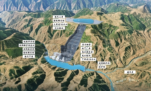 芒康熱巴抽水蓄能電站位于西藏自治區(qū)昌都市芒康縣,距昌都的直線(xiàn)距離約165千米。上水庫(kù)位于瀾滄江左岸二級(jí)支流達(dá)其曲右岸尼吉拉臺(tái)地上,通過(guò)開(kāi)挖筑壩形成,流域面積1.06平方千米;下水庫(kù)位于達(dá)其曲干流上游河段,利用攔河壩和攔沙壩之間的天然地形成庫(kù),下水庫(kù)攔沙壩控制流域面積328平方千米、攔沙壩~攔河壩區(qū)間流域面積4.75平方千米。電站連續(xù)滿(mǎn)發(fā)小時(shí)數(shù)6小時(shí),初擬額定水頭702米。樞紐工程主要由上水庫(kù)、下水庫(kù)、地下輸水發(fā)電系統(tǒng)、地面開(kāi)關(guān)站和補(bǔ)水系統(tǒng)等建筑物組成。上水庫(kù)采用瀝青混凝土面板堆石壩,最大壩高66米,采用全庫(kù)盆瀝青混凝土面板防滲方案;下水庫(kù)攔河壩采用鋼筋混凝土面板堆石壩,最大壩高105米;下水庫(kù)攔沙壩采用碾壓混凝土重力壩,最大壩高60.5米;輸水線(xiàn)路水平距離約2940米,距高比4.24。從日曲左岸取水,永久補(bǔ)水線(xiàn)路采用地下埋管的布置方式,補(bǔ)水線(xiàn)路長(zhǎng)約2.12千米。