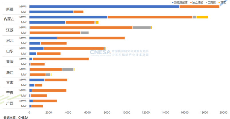 2024年中國(guó)新型儲(chǔ)能新增投運(yùn)43.7GW/109.8GWh,同比增長(zhǎng)+103%/+136%。從區(qū)域分布看,新疆和內(nèi)蒙古分列能量規(guī)模和功率規(guī)模第一,也是分別以新能源配儲(chǔ)和獨(dú)立儲(chǔ)能為主導(dǎo)的省份。