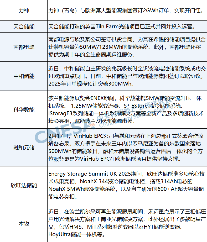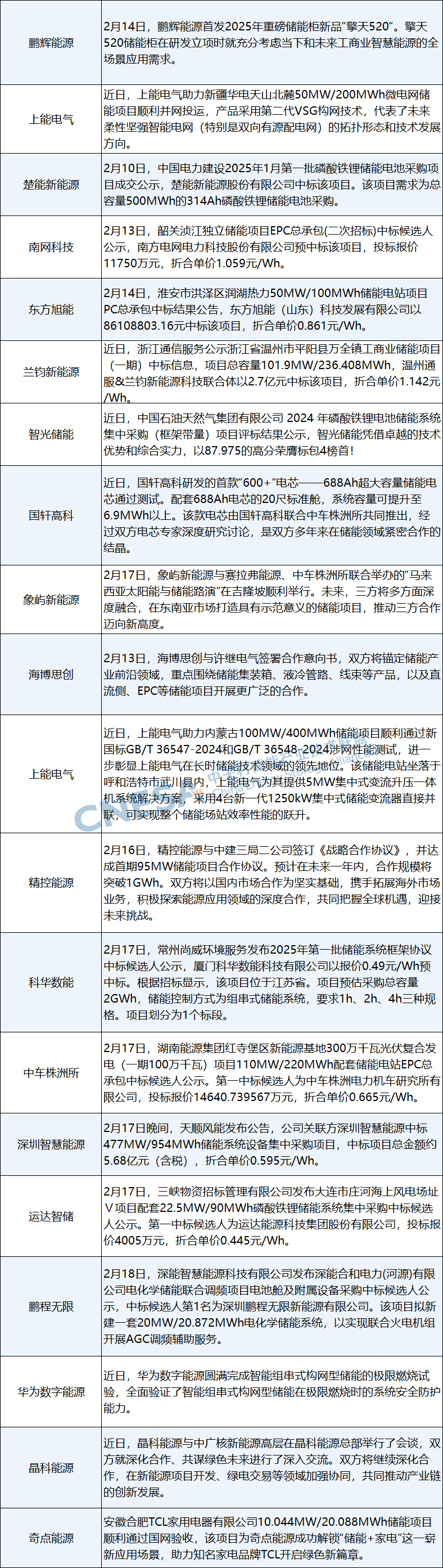 近兩周來,楚能新能源、南網(wǎng)科技、中車株洲所、蘭鈞新能源、智光儲能、科華數(shù)能、運達智儲、鵬程無限等企業(yè)中標國內儲能項目采購;上能電氣、奇點能源等項目順利并網(wǎng);華為數(shù)字能源圓滿完成智能組串式構網(wǎng)型儲能的極限燃燒試驗;晶科能源與中廣核新能源深化了合作;鵬輝能源首發(fā)2025年工商業(yè)儲能柜新品“擎天520“;海博思創(chuàng)與許繼電氣錨定儲能產(chǎn)業(yè)前沿領域開展廣泛合作等等,國內市場在招中標、戰(zhàn)略合作、新品發(fā)布等方面全面出擊。