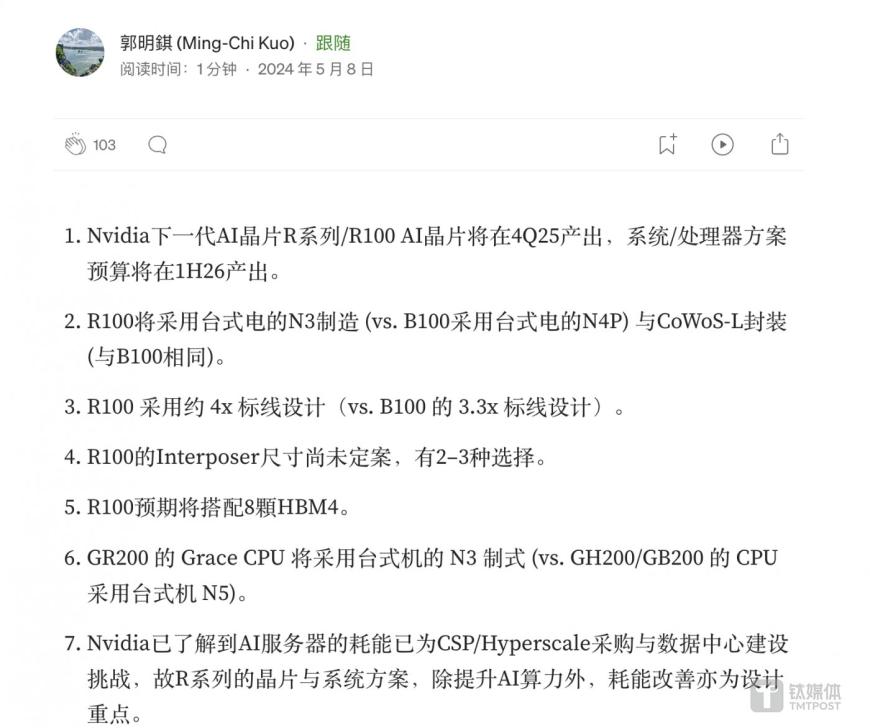 天風(fēng)國際證券分析師郭明錤指出,英偉達(dá)下一代R系列/R100 AI芯片將于2025年第四季度量產(chǎn),采用臺積電3nm制程、4個reticle設(shè)計,搭配8顆HBM4,重點改善能耗。最早在明年,R100 AI GPU就將登場。