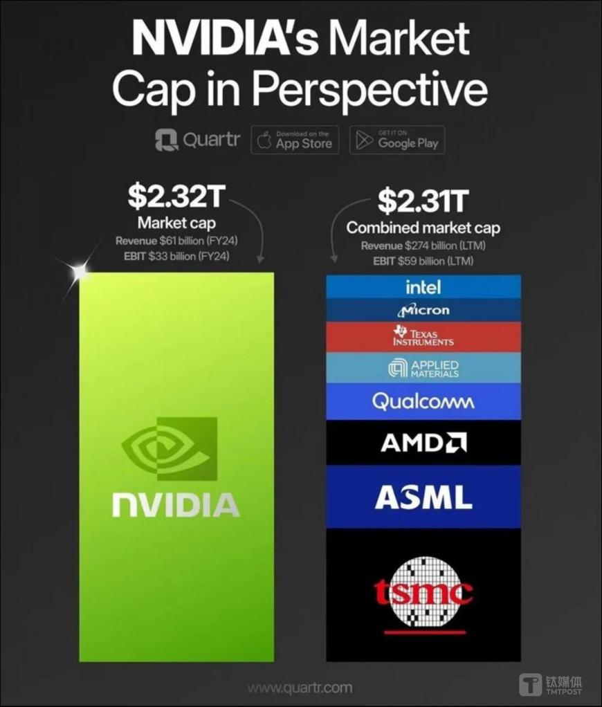 鈦媒體App 5月24日消息,截至今早美股收盤,“AI之王”英偉達(dá)(NASDAQ:NVDA)市值一天內(nèi)暴漲2180億美元(約合人民幣1.56萬億元),達(dá)到2.56萬億美元市值——超過臺積電、阿斯麥、AMD、高通、應(yīng)用材料、德州儀器、美光科技、英特爾等半導(dǎo)體巨頭的市值總和。同時,股價也首次沖破1000美元/股,創(chuàng)下歷史新高。