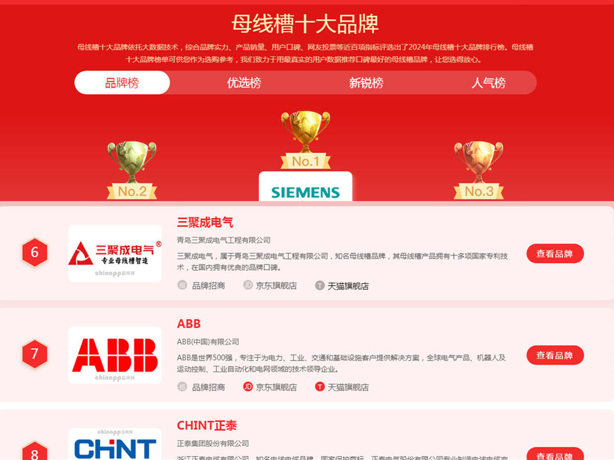 近日,2024年度母線槽十大品牌由發(fā)布,三聚成電氣、施耐德電氣、ABB、西門(mén)子等榮耀上榜。據(jù)了解,本次母線槽十大品牌排行榜,經(jīng)過(guò)統(tǒng)計(jì)有10家品牌成功入選中國(guó)母線槽十大品牌排行榜,經(jīng)過(guò)網(wǎng)民投票和專(zhuān)家的綜合評(píng)估,最終確定了母線槽十大品牌名單: