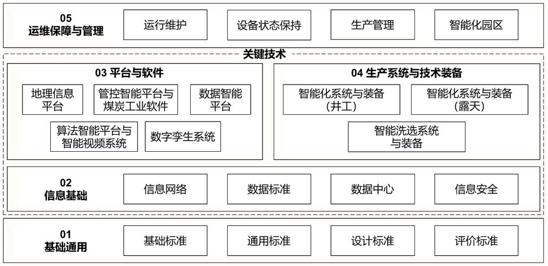 3.設計標準,主要包括煤炭工業(yè)智能化礦井設計、智能化生產(chǎn)系統(tǒng)建設、生產(chǎn)保障系統(tǒng)建設、智能化選煤廠建設、智能化園區(qū)建設技術規(guī)范等方面標準。