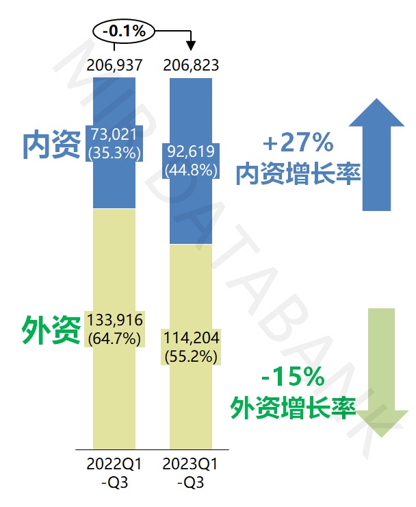 但我國近年來國產(chǎn)替代加速,導(dǎo)致內(nèi)資廠商市場份額不斷提升。據(jù)MIR睿工業(yè)數(shù)據(jù):2023年第三季度,國產(chǎn)工業(yè)機(jī)器人廠商扛住了壓力,同比增速達(dá)26.8%,遠(yuǎn)高于整體市場增速。且內(nèi)資廠商市場份額持續(xù)增加,占比提升至45%。