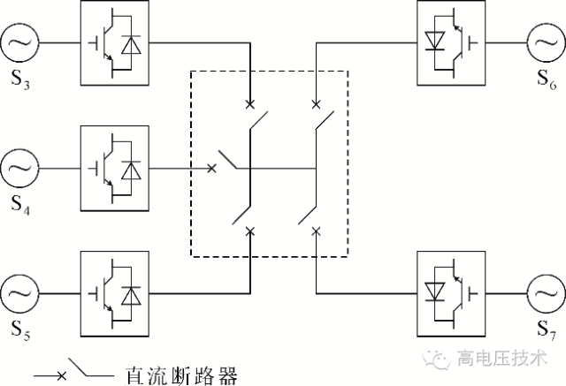 兩端VSC-HVDC系統(tǒng)拓?fù)浣Y(jié)構(gòu)較為簡(jiǎn)單,通過點(diǎn)對(duì)點(diǎn)的連接實(shí)現(xiàn)有功功率的傳輸。在兩端基礎(chǔ)上發(fā)展而來的多端柔性直流輸電系統(tǒng)(VSC-MTDC),能夠?qū)崿F(xiàn)多電源供電和多落點(diǎn)受電,可以采用不同的拓?fù)浣Y(jié)構(gòu)形成直流網(wǎng)絡(luò),極大地提高了直流輸電系統(tǒng)的操作靈活性和系統(tǒng)的可靠性。多端直流系統(tǒng)的拓?fù)淇梢苑譃榇?lián)型和并聯(lián)型,如下圖1-圖4所示,其中并聯(lián)型包括星形拓?fù)?、環(huán)形拓?fù)浜托切?中央環(huán)形拓?fù)涞取?/p>