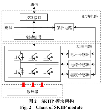 賽米控智能集成功率(Semikron integrated intel-ligent power,SKIIP)模塊[6]集成了功率半導(dǎo)體器件、散熱器以及具有保護(hù)和監(jiān)測(cè)電路的門(mén)極驅(qū)動(dòng)電路,并具有用于短路和過(guò)電流保護(hù)的閉環(huán)電流傳感器,同時(shí)還集成了溫度傳感器。采用SKIIP模塊[6]可以大大簡(jiǎn)化逆變器主電路,提高系統(tǒng)的抗干擾能力,該模塊具有標(biāo)準(zhǔn)接口,其架構(gòu)如圖2所示。