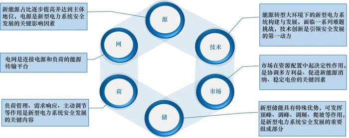 新型電力系統(tǒng)是實現(xiàn)“雙碳”目標、重塑能源安全格局的重要載體,構建新型電力系統(tǒng)是提高能源安全韌性的根本性舉措。新型電力系統(tǒng)的安全發(fā)展主要受到源、網(wǎng)、荷、儲、市場、技術六大因素的綜合影響(見圖1)。
