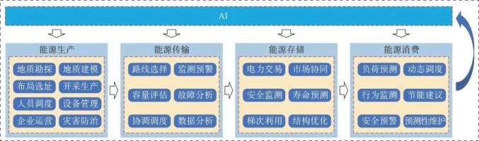 能源全產(chǎn)業(yè)鏈與AI的互相影響逐漸加深,如圖1所示。在能源生產(chǎn)環(huán)節(jié),AI技術(shù)應(yīng)用于不可再生能源(煤、石油、天然氣等)地質(zhì)勘探、地質(zhì)建模過(guò)程,極大提高勘探的效率與準(zhǔn)確性。在開采過(guò)程中,AI驅(qū)動(dòng)的智能作業(yè)系統(tǒng)(設(shè)備)能夠根據(jù)實(shí)時(shí)地質(zhì)條件自動(dòng)調(diào)整作業(yè)參數(shù),提高作業(yè)效率和安全性。從礦床開采全生產(chǎn)周期來(lái)看,基于AI分析的生產(chǎn)優(yōu)化模型可以通過(guò)協(xié)調(diào)調(diào)度和運(yùn)營(yíng)優(yōu)化,合理調(diào)配開采作業(yè)強(qiáng)度,優(yōu)化生產(chǎn)周期。在可再生能源生產(chǎn)方面,利用AI技術(shù)優(yōu)化選址、設(shè)備運(yùn)行參數(shù)以及與其他能源形式的協(xié)同調(diào)度,在一定程度上可克服太陽(yáng)能、風(fēng)能等間歇性能源的不確定性,提升可再生能源在電網(wǎng)中的接入比例和穩(wěn)定性,促進(jìn)能源結(jié)構(gòu)的優(yōu)化。