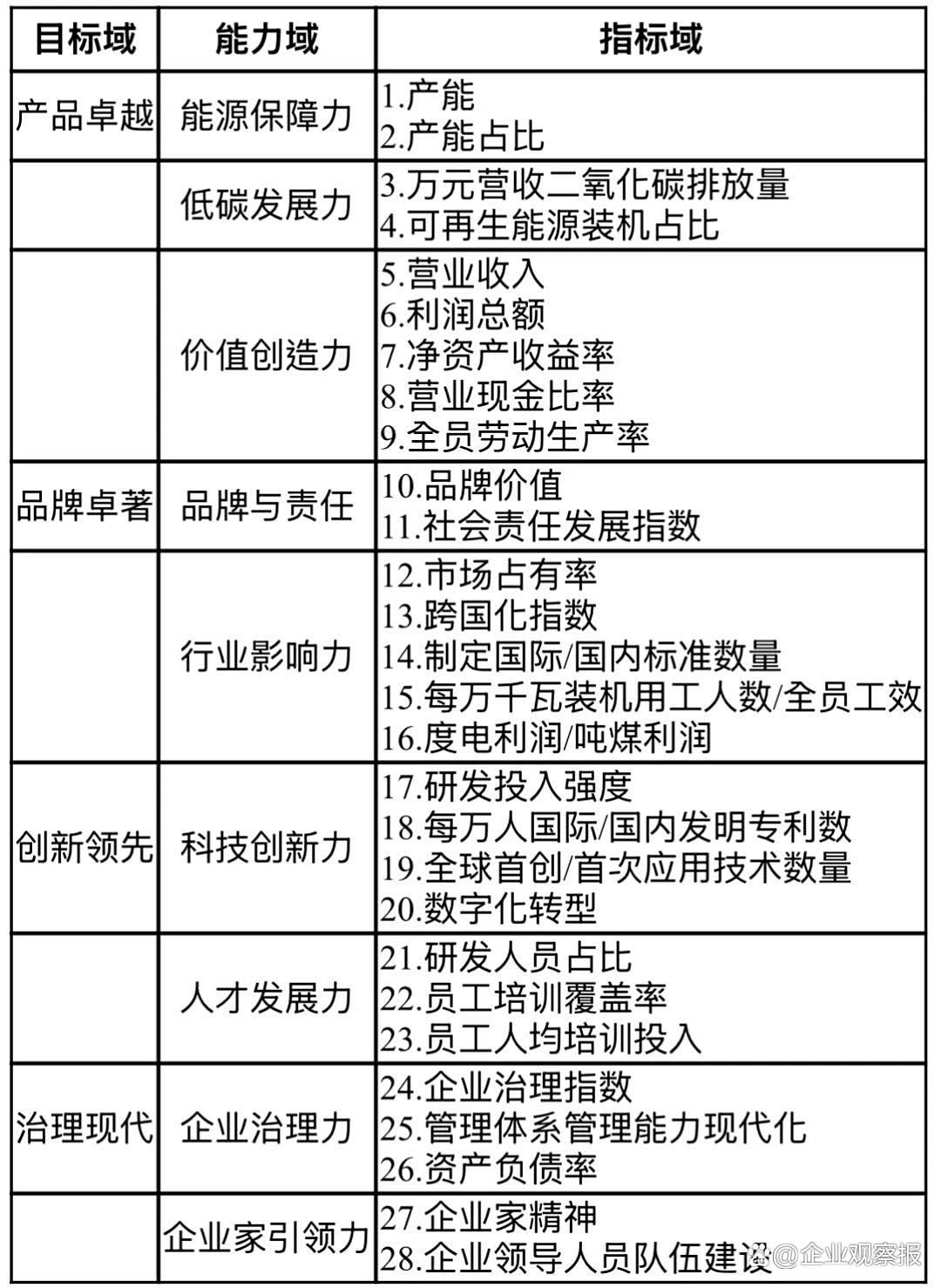 在構建了目標域與能力域的關系基礎上,以產(chǎn)品卓越、品牌卓著、創(chuàng)新領先、治理現(xiàn)代為目標,由每項關鍵能力延伸出具體指標,從而形成三級結構的世界一流能源電力企業(yè)對標指標體系,見表1。指標體系共包含28項具體指標:第一級包含4個維度,分別是產(chǎn)品卓越、品牌卓著、創(chuàng)新領先、治理現(xiàn)代;第二級是以第一級指標為目標、結合能源電力企業(yè)經(jīng)營發(fā)展的特征及趨勢而確定的8項關鍵成功要素,分別是產(chǎn)品保障力、價值創(chuàng)造力、品牌與責任、行業(yè)影響力、科技創(chuàng)新力、商業(yè)創(chuàng)新力、治理力以及企業(yè)家引領力;第三級是第二級指標延伸的28項指標,涵蓋了國務院國資委關于世界一流企業(yè)的評價指標和中央企業(yè)的年度考核指標,反映了企業(yè)包含科技創(chuàng)新、行業(yè)引領和社會責任等方面的綜合實力和水平。