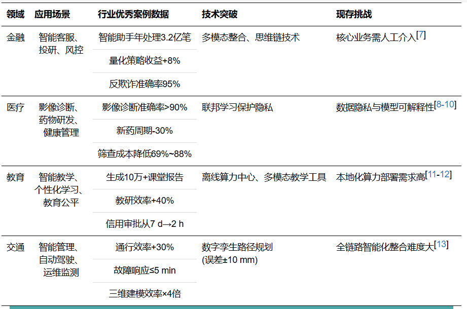 當(dāng)前,AI大模型已在金融、醫(yī)療、教育、交通等領(lǐng)域?qū)崿F(xiàn)深度滲透,展現(xiàn)出顯著的產(chǎn)業(yè)價(jià)值與技術(shù)潛力。如表1所示,在金融領(lǐng)域,智能客服與風(fēng)控系統(tǒng)的高效運(yùn)作體現(xiàn)了多模態(tài)整合與思維鏈技術(shù)的成熟應(yīng)用,但核心決策仍依賴人工。醫(yī)療領(lǐng)域通過聯(lián)邦學(xué)習(xí)等技術(shù)突破,在影像診斷、藥物研發(fā)等方面取得成果,但數(shù)據(jù)隱私與模型可解釋性仍是關(guān)鍵瓶頸。教育領(lǐng)域依托離線算力中心與多模態(tài)工具,實(shí)現(xiàn)教學(xué)效率躍升,而本地化算力需求成為規(guī)?;瘧?yīng)用的制約因素。交通領(lǐng)域借助數(shù)字孿生技術(shù)顯著提升運(yùn)維效率,但全鏈路智能化整合仍需突破。