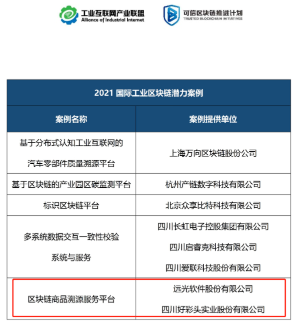 近日,由湖南省工業(yè)和信息化廳主辦的2021國(guó)際工業(yè)區(qū)塊鏈大會(huì)在長(zhǎng)沙順利召開(kāi),會(huì)上發(fā)布了《2021工業(yè)區(qū)塊鏈案例集》、《工業(yè)區(qū)塊鏈應(yīng)用指南》、《2021工業(yè)區(qū)塊鏈技術(shù)應(yīng)用及趨勢(shì)報(bào)告》等重磅成果。憑借在區(qū)塊鏈領(lǐng)域的創(chuàng)新技術(shù)能力及應(yīng)用成果,遠(yuǎn)光軟件區(qū)塊鏈商品溯源服務(wù)平臺(tái)成功入選《2021工業(yè)區(qū)塊鏈案例集》。