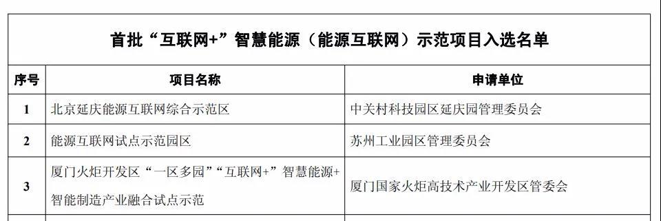 “廈門火炬開發(fā)區(qū)‘一區(qū)多園’‘互聯網+’智慧能源+智能制造產業(yè)融合試點示范”項目屬于國家能源局首批“互聯網+”智慧能源(能源互聯網)示范項目之一,項目牽頭單位為廈門國家火炬高技術產業(yè)開發(fā)區(qū)管理委員會,項目于2017年3月6日在國家能源局網站公示。