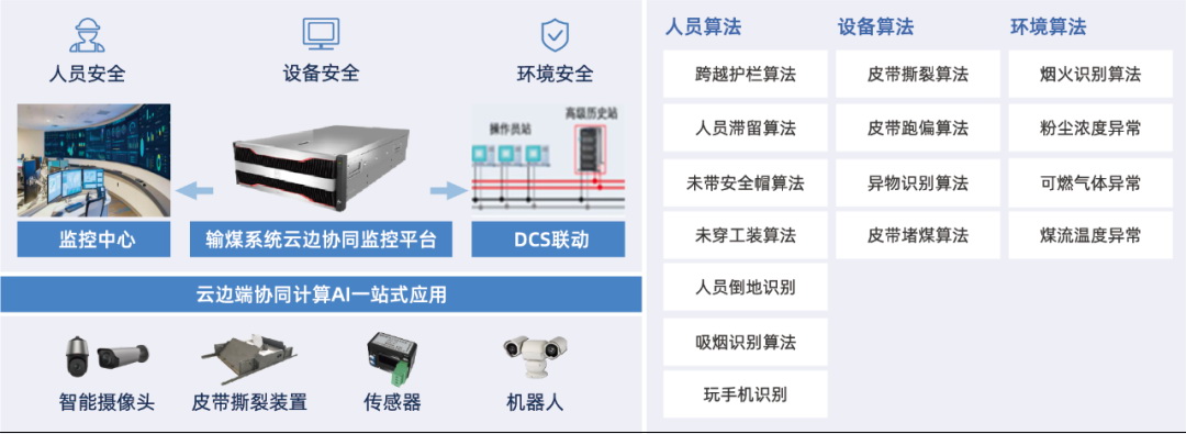 方案通過云邊端協(xié)同架構(gòu)把智能采集裝置、皮帶撕裂識別裝置、環(huán)境傳感器等進行數(shù)據(jù)的統(tǒng)一匯聚分析,對異常情況進行識別和報警,并通過DCS系統(tǒng)控制聯(lián)動,提高人員、設(shè)備、環(huán)境的安全管理水平。 在設(shè)備故障監(jiān)測方面,可對皮帶異物、落煤口堵煤、皮帶跑偏、運行環(huán)境火花等情況進行識別,避免異物運輸對皮帶造成意外損傷或引發(fā)事故;在人員安全管控方面,設(shè)置吸煙、安全帽佩戴、翻越護欄、人員倒地等相關(guān)算法,對巡檢人員的不安全行為進行識別管控;在環(huán)境監(jiān)控方面,通過安裝布設(shè)有毒有害氣體監(jiān)測傳感器、溫度傳感器、粉塵監(jiān)測傳感器等對輸煤環(huán)境進行在線實時監(jiān)測,及時發(fā)現(xiàn)高溫、有毒有害氣體超標(biāo)、粉塵濃度超標(biāo)并預(yù)警,最大程度保障人員操作環(huán)境安全。