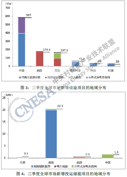新增投運(yùn)項(xiàng)目中,美國(guó)的裝機(jī)規(guī)模最大,為20.5MW,占三季度新增投運(yùn)項(xiàng)目裝機(jī)總規(guī)模的90%,項(xiàng)目幾乎全部應(yīng)用于調(diào)頻輔助服務(wù)領(lǐng)域。