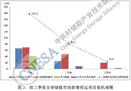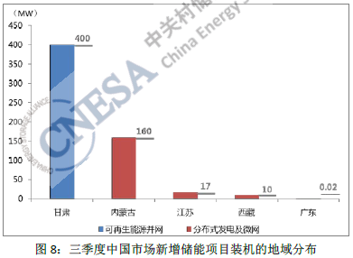 2016年三季度,中國(guó)新增投運(yùn)項(xiàng)目3個(gè),裝機(jī)規(guī)模1.5MW,同比增長(zhǎng)50%,環(huán)比今年二季度下降了87%。項(xiàng)目全部集中在分布式發(fā)電及微網(wǎng)領(lǐng)域。