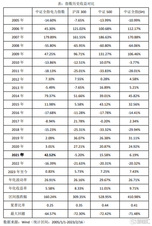 再來看過往收益率,據(jù)WIND統(tǒng)計(jì)顯示,自基日(2014年12月31日)以來,截至2023年2月16日,中證全指電力指數(shù)年化收益率約5.6%,整體表現(xiàn)落后于大盤基準(zhǔn)(中證全指)。此外,該指數(shù)的年化波動(dòng)率為26.9%,同樣低于部分大盤指數(shù)。不過自2021年起,由于電力市場(chǎng)化改革的加速,該指數(shù)取得了42.5%的收益,遠(yuǎn)遠(yuǎn)領(lǐng)先其他大盤指數(shù)。同時(shí),其2022年的表現(xiàn)也領(lǐng)先大盤指數(shù)。