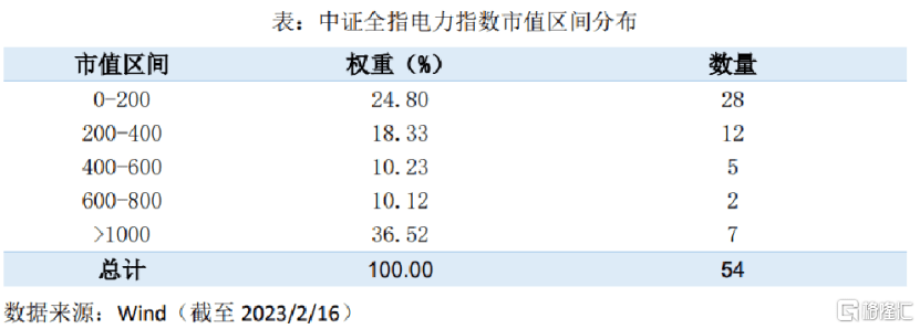 從市值分布來看,中證全指電力指數(shù)呈現(xiàn)較為明顯的中小盤特征,其中市值規(guī)模在400億之下的成份股權(quán)重合計(jì)占比為43%,數(shù)量達(dá)到40只。