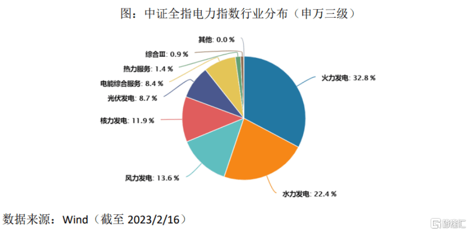 就細(xì)分行業(yè)分布來看,該指數(shù)成分股集中于電力行業(yè),重點(diǎn)關(guān)注火電、水電、新能源發(fā)電,并共同捕捉傳統(tǒng)發(fā)電和新能源發(fā)電領(lǐng)域的投資機(jī)會(huì)。其中,以權(quán)重最大的成分股長(zhǎng)江電力(600900.SH)為例,火電占比達(dá)32.8%,水電占22%,風(fēng)電占13%,光伏占比不到10%。