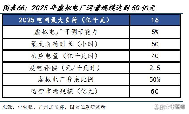 預(yù)計(jì) 2025 年虛擬電廠投資規(guī)模達(dá)到 800 億元,運(yùn)營市場(chǎng)規(guī)模達(dá)到 50 億元?,F(xiàn)階段主要 的盈利模式為通過需求側(cè)響應(yīng)賺取輔助服務(wù)費(fèi)用后的分成。據(jù)中電聯(lián)預(yù)計(jì),2025 年我國 全社會(huì)用電量將達(dá) 9.5 萬億千瓦時(shí),而最大負(fù)荷將達(dá)到 16 億千瓦,按 5%可調(diào)節(jié)能力、投 資成本 1000 元/千瓦計(jì)算,預(yù)計(jì)到 2025 年,虛擬電廠投資規(guī)模有望達(dá) 800 億元。參考目 前峰值負(fù)荷時(shí)長水平,我們預(yù)計(jì) 2025 峰值負(fù)荷將達(dá)到 50 小時(shí),對(duì)應(yīng) 2025 年電網(wǎng)需求側(cè) 響應(yīng)電量 40 億千瓦時(shí)。目前我國虛擬電廠處于發(fā)展初期,度電補(bǔ)償較高以刺激時(shí)長,參 考《廣州市虛擬電廠實(shí)施細(xì)則》0-5 元/千瓦時(shí)的削峰響應(yīng)補(bǔ)貼,預(yù)計(jì) 2025 年虛擬電廠進(jìn) 入商業(yè)化運(yùn)營后,補(bǔ)償標(biāo)準(zhǔn)為 2.5 元/千瓦時(shí)。假設(shè)分成比例為 50%,則預(yù)計(jì) 2025 年虛擬 電廠運(yùn)營市場(chǎng)規(guī)模將達(dá)到 50 億元。