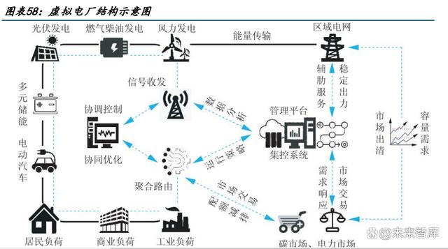 虛擬電廠本質(zhì)上是一套軟件平臺(tái)系統(tǒng),核心為“通信”和“聚合”。通過先進(jìn)信息通信技 術(shù)和軟件系統(tǒng),實(shí)現(xiàn)分布式電源、儲(chǔ)能系統(tǒng)、可控負(fù)荷、電動(dòng)汽車等分布式能源資源的聚 合和協(xié)調(diào)優(yōu)化,以作為一個(gè)特殊電廠參與電力市場(chǎng)和電網(wǎng)運(yùn)行的電源協(xié)調(diào)管理系統(tǒng),為配 電網(wǎng)和輸電網(wǎng)提供管理和輔助服務(wù)。虛擬電廠概念的核心可以總結(jié)為“通信”和“聚合”, 關(guān)鍵技術(shù)主要包括協(xié)調(diào)控制技術(shù)、智能計(jì)量技術(shù)以及信息通信技術(shù)。 虛擬電廠分為兩類:“負(fù)荷類”虛擬電廠,和“源網(wǎng)荷儲(chǔ)一體化”虛擬電廠。1)“負(fù)荷類” : 聚合了具備調(diào)節(jié)能力的電動(dòng)汽車、充電樁等市場(chǎng)化用戶,作為一個(gè)整體,對(duì)外提供負(fù)荷側(cè) 靈活性相應(yīng)調(diào)節(jié)服務(wù)。2)“源網(wǎng)荷儲(chǔ)一體化”:聚合新能源發(fā)電、用戶及配儲(chǔ)一系列環(huán)節(jié), 作為獨(dú)立市場(chǎng)主體參與電力市場(chǎng)、具備自主調(diào)峰調(diào)節(jié)能力。 具備“源-荷”雙重身份,有效實(shí)現(xiàn)削峰填谷。虛擬電廠把各類可調(diào)負(fù)荷資源匯聚,根據(jù) 電網(wǎng)削峰填谷的需求,進(jìn)行線上填報(bào),計(jì)劃下發(fā),執(zhí)行反饋,類似于線上工單派單系統(tǒng)。 電網(wǎng)給調(diào)度指令計(jì)劃,需求響應(yīng)調(diào)控計(jì)劃,提前幾天/幾周把計(jì)劃發(fā)下來。負(fù)荷集成商, 虛擬電廠運(yùn)營商,會(huì)把計(jì)劃告訴客戶,哪些時(shí)段把負(fù)荷停掉,把用電負(fù)荷降下來,具有源 -荷雙重身份。