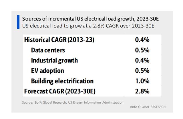 美銀美林在最新發(fā)布的研報(bào)中表示,隨著AI技術(shù)的飛速發(fā)展,美國(guó)電網(wǎng)的電力需求將面臨著前所未有的增長(zhǎng),預(yù)計(jì)2023年至2030年,美國(guó)電力需求將以2.8%的年復(fù)合增長(zhǎng)率(CAGR)增長(zhǎng)。