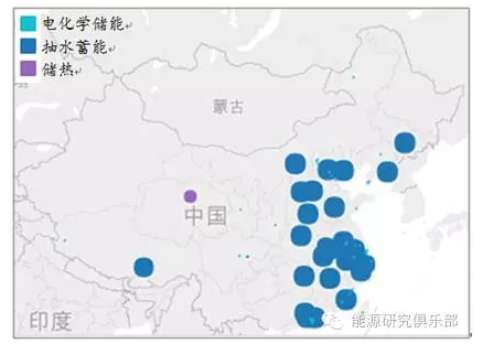 目前來看,我國儲能產(chǎn)業(yè)還處于發(fā)展的初期階段,以應(yīng)用示范為主。據(jù)美國能源部全球儲能數(shù)據(jù)庫2016年8月16日更新數(shù)據(jù)顯示,中國累計儲能總裝機32.10GW(94個在運行項目),其中抽水蓄能32GW(34個在運項目)、電化學(xué)儲能0.05GW(58個在運項目)、儲熱0.05GW(2個)。抽水蓄能電站和電化學(xué)儲能項目都主要集中在我國東部沿海城市,詳見圖6。