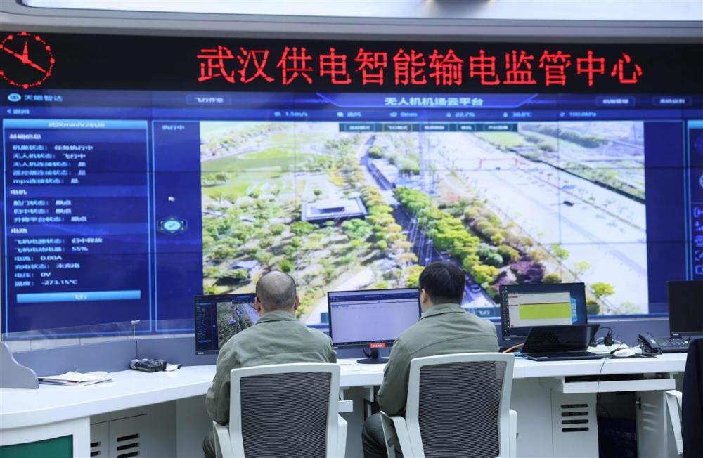 10月23日,武漢漢口江灘,一架白色的無人機在高空穿梭,機頭對準濱江區(qū)內的國家電網線路來回進行掃描、拍攝。與此同時,距離巡檢現(xiàn)場數(shù)公里外的國網武漢供電公司的巨型屏幕上,無人機的超高清畫面即時顯示。