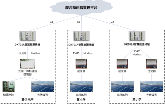 基于DK701智能終端平臺的優(yōu)勢特性,目前江行智能已成功開發(fā)DK701A智慧能源終端和DK701E儲能EMS就地控制器,并應用到虛擬電廠聚合商運營管理系統(tǒng)及數(shù)字配電網(wǎng)臺區(qū)儲能等項目建設,在光伏、儲能、充電樁等具體場景發(fā)揮了重要作用。以國網(wǎng)寧夏某公司打造的聚合商運營管理系統(tǒng)為例,通過在供電所、小學配置智慧能源終端,可將自身所擁有的分布式光伏、分布式儲能、電采暖等可調(diào)節(jié)資源數(shù)據(jù)接入省級虛擬電廠運營管理平臺,實現(xiàn)對可調(diào)節(jié)資源的可觀、可測、可調(diào)、可控。