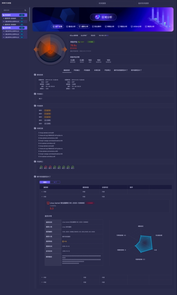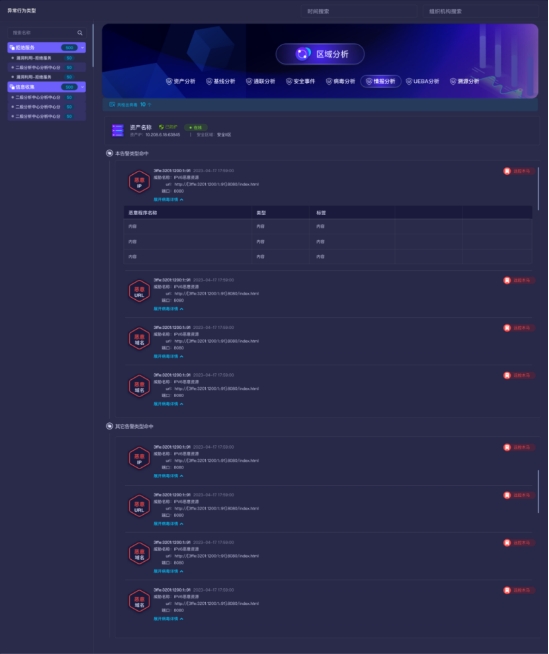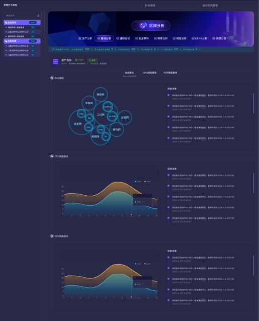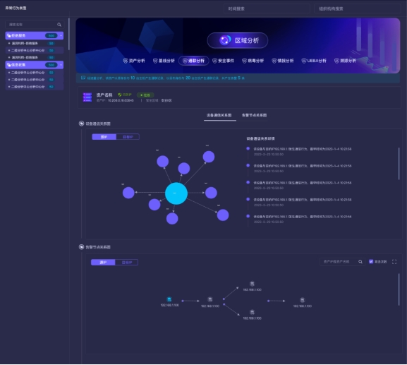 長(zhǎng)揚(yáng)態(tài)感網(wǎng)絡(luò)空間安全分析功能以資產(chǎn)為核心,從區(qū)域、聯(lián)通性、病毒、情報(bào)、漏洞、基線、溯源、UEBA行為等多個(gè)方面進(jìn)行全方位、立體化分析。