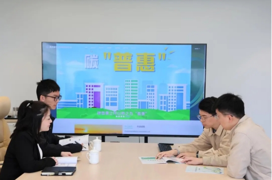蘇州供電公司碳普惠運營團隊成員為客戶介紹一站式碳中和服務。