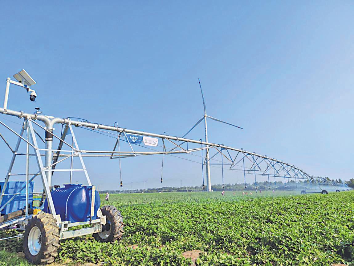 在延津縣,萬畝高標準農(nóng)田里的夏玉米已進入灌漿期,該階段澆水增肥是增加產(chǎn)量、保障豐產(chǎn)豐收的關(guān)鍵。在塔鋪街道大柳樹村的高標準農(nóng)田里,幾十米寬的大型平移式噴灌機似巨鳥展翅,在田間緩緩移動,“羽翼”下的幾十個噴頭噴出均勻的“水霧墻”,滋潤著莊稼,讓玉米“吃飽喝足”。中國移動5G水肥一體化智能灌溉技術(shù)將灌溉和施肥兩個農(nóng)業(yè)生產(chǎn)過程融合在一起,不僅實現(xiàn)了澆地向澆苗轉(zhuǎn)變,還能將水連同肥料直接輸送到玉米地里,讓玉米“渴”了就“喝”、“餓”了就“吃”,實現(xiàn)了對農(nóng)田水分和養(yǎng)分的綜合管理。