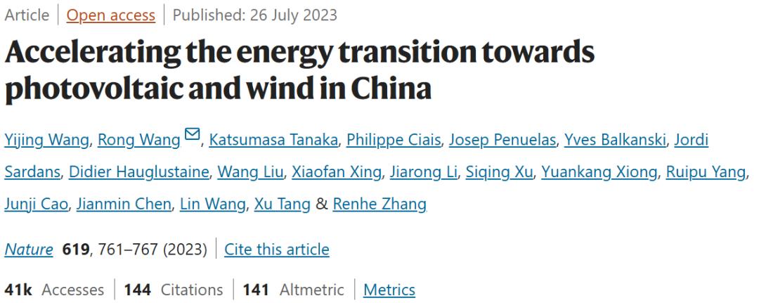 2024年夏天,王怡靜作為第一作者的論文《Accelerating the energy transition towards photovoltaic and wind in China》(《加速中國光伏發(fā)電和風(fēng)電的能源轉(zhuǎn)型》)在《自然》(Nature)上發(fā)表。
